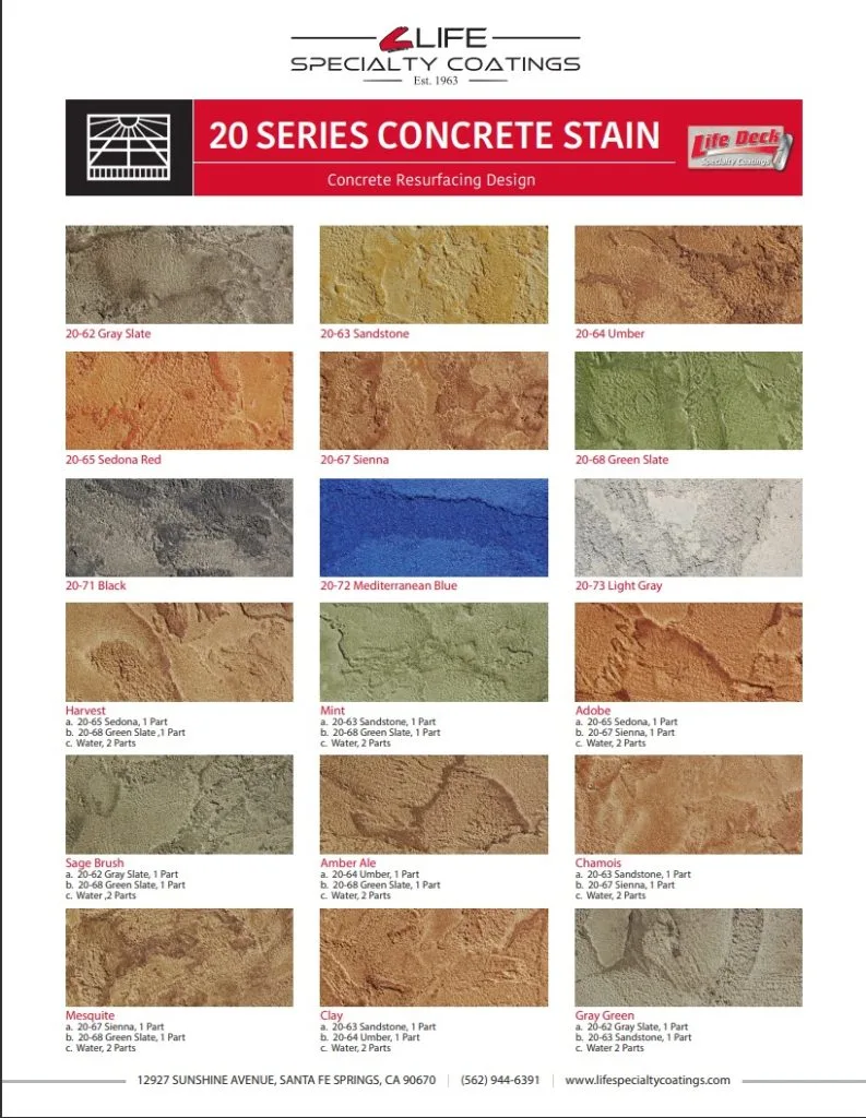 - We carry the Americrete A-1000 water-based acrylic stain in 21 standard colors (all mixable for custom shades), and the Life Deck 20 Series transparent penetrating stain for multi-hue organic effects similar to acid stain — without the hazards. Both are available for same-day pickup at our South Las Vegas (4125 Wagon Trail Ave) and North Las Vegas (4601 E Cheyenne Ave Ste 107) locations.